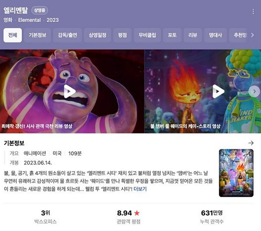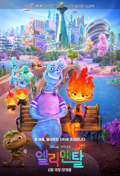 오랜만에 영화관에 가서 영화를 보고 왔다. 그 영화는 다름 아닌 디즈니, 픽사의 '엘리멘탈(Elemental,2023)'이다. 꽤나 보고 싶었던 영화였기도 했고 개봉일이 2023년 6월 14일이었는데 거의 상영이 끝나가는 느낌이 들어 부랴부랴 영화관으로 가서 봤다. 주변지인들이 울면서 나오는 영화라고 휴지를 챙기라는 말에 코웃음 쳤는데 생각보다 마음이 찡한 장면들이 있었다. 참고로 영화에 쿠키영상은 없다.